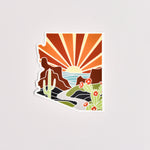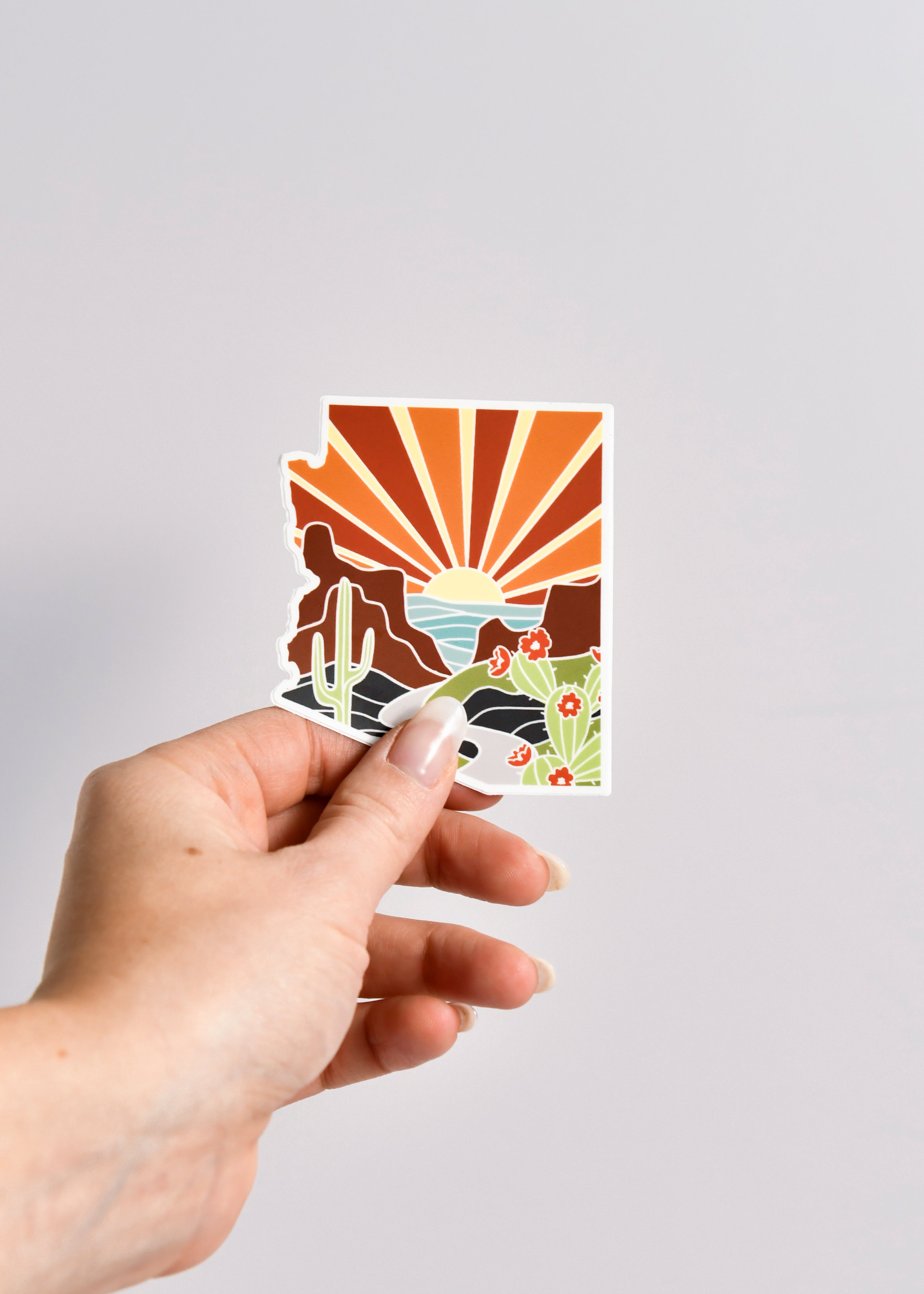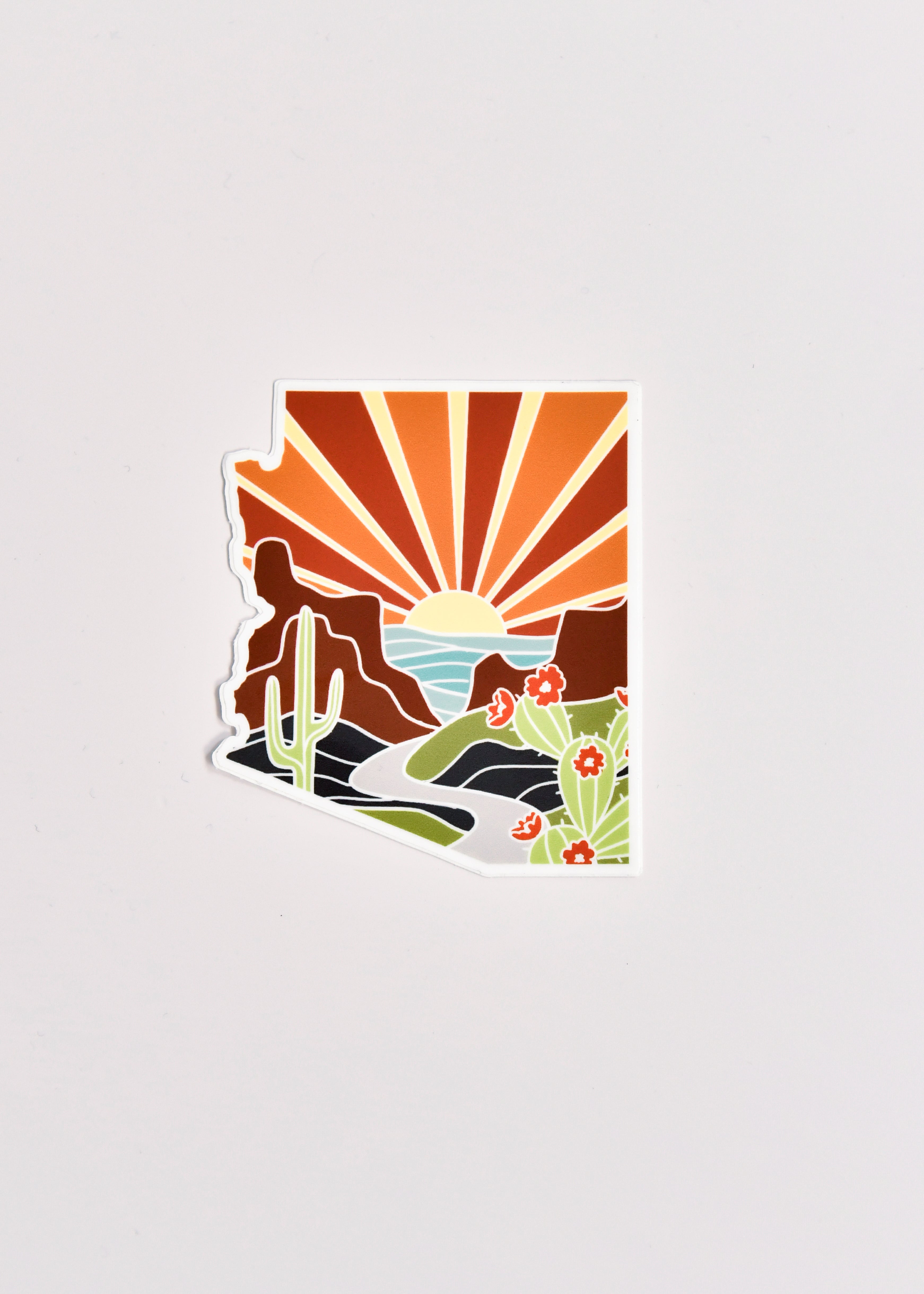 Each sticker is 3" tall—the PERFECT size to jazz up that empty surface you’re thinking of right now. The featured artwork is an original design by Summer Stokes and is inspired by Arizona’s beloved landscape.