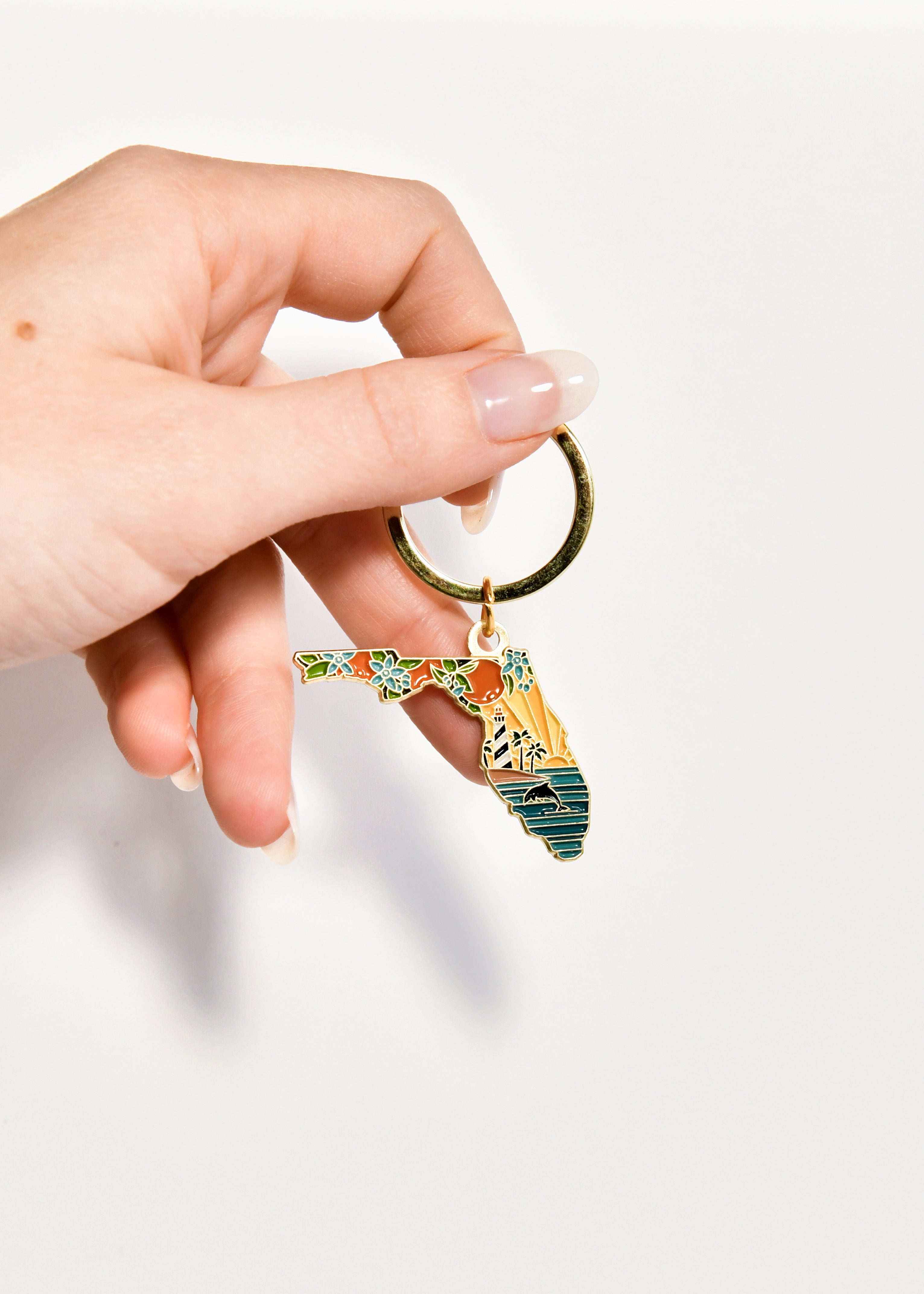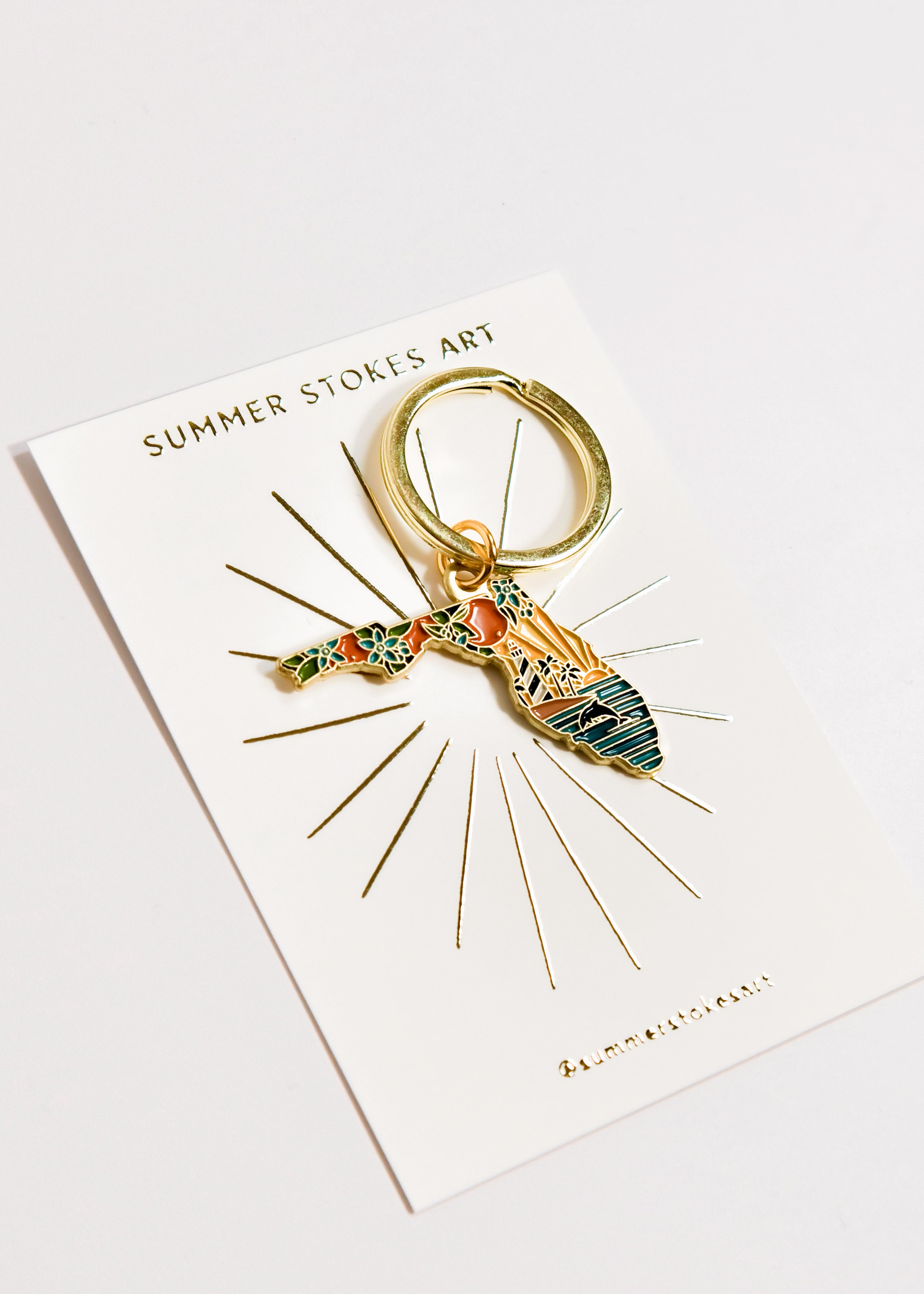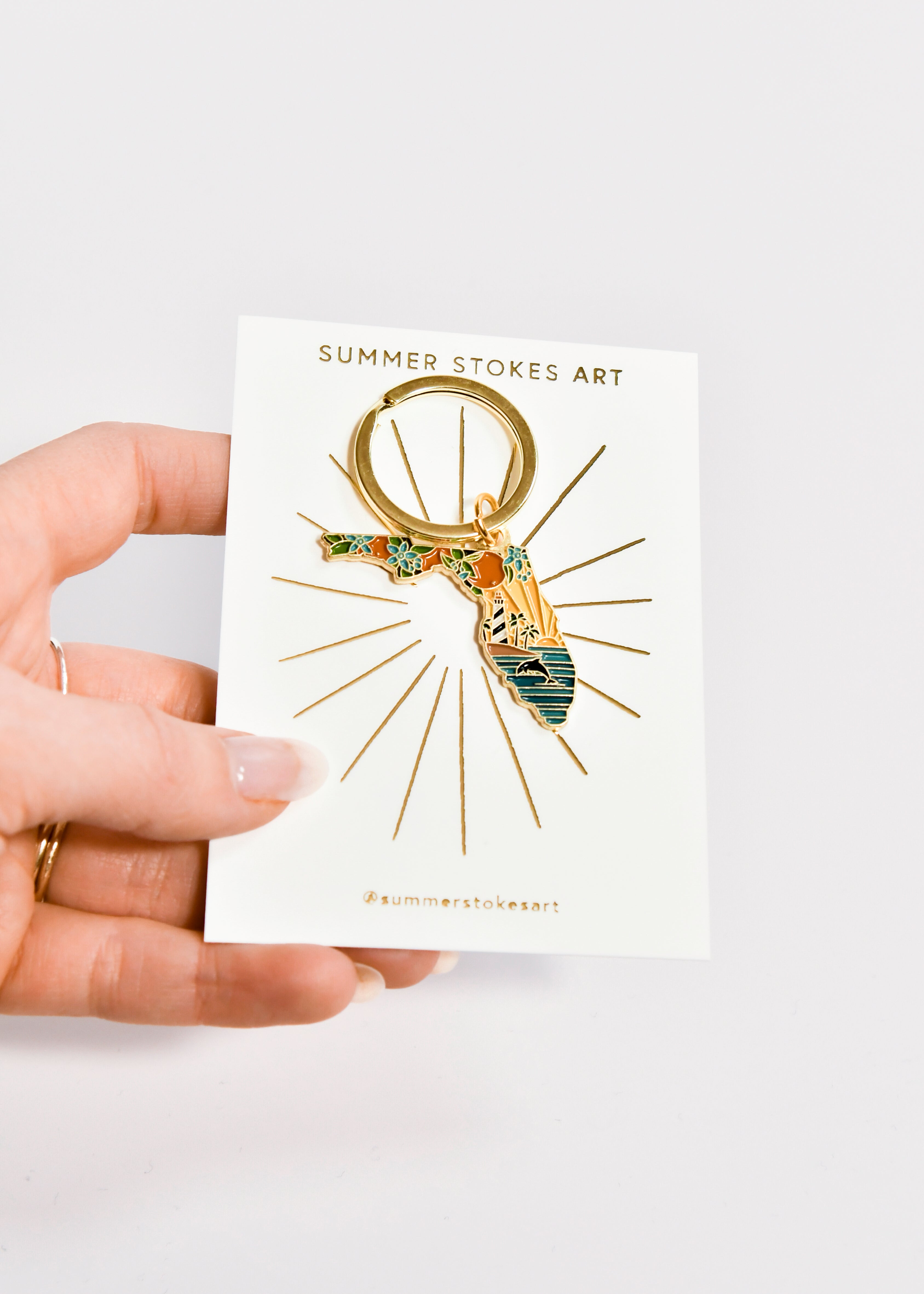 Each state charm is 1.5" (the PERFECT size to turn your keyring from just a tool to an ✨accessory✨) and is laser-engraved and enamel-filled, preserving every tiny detail of the design. The featured artwork is an original design by Summer Stokes and is inspired by Florida’s beloved landscape.