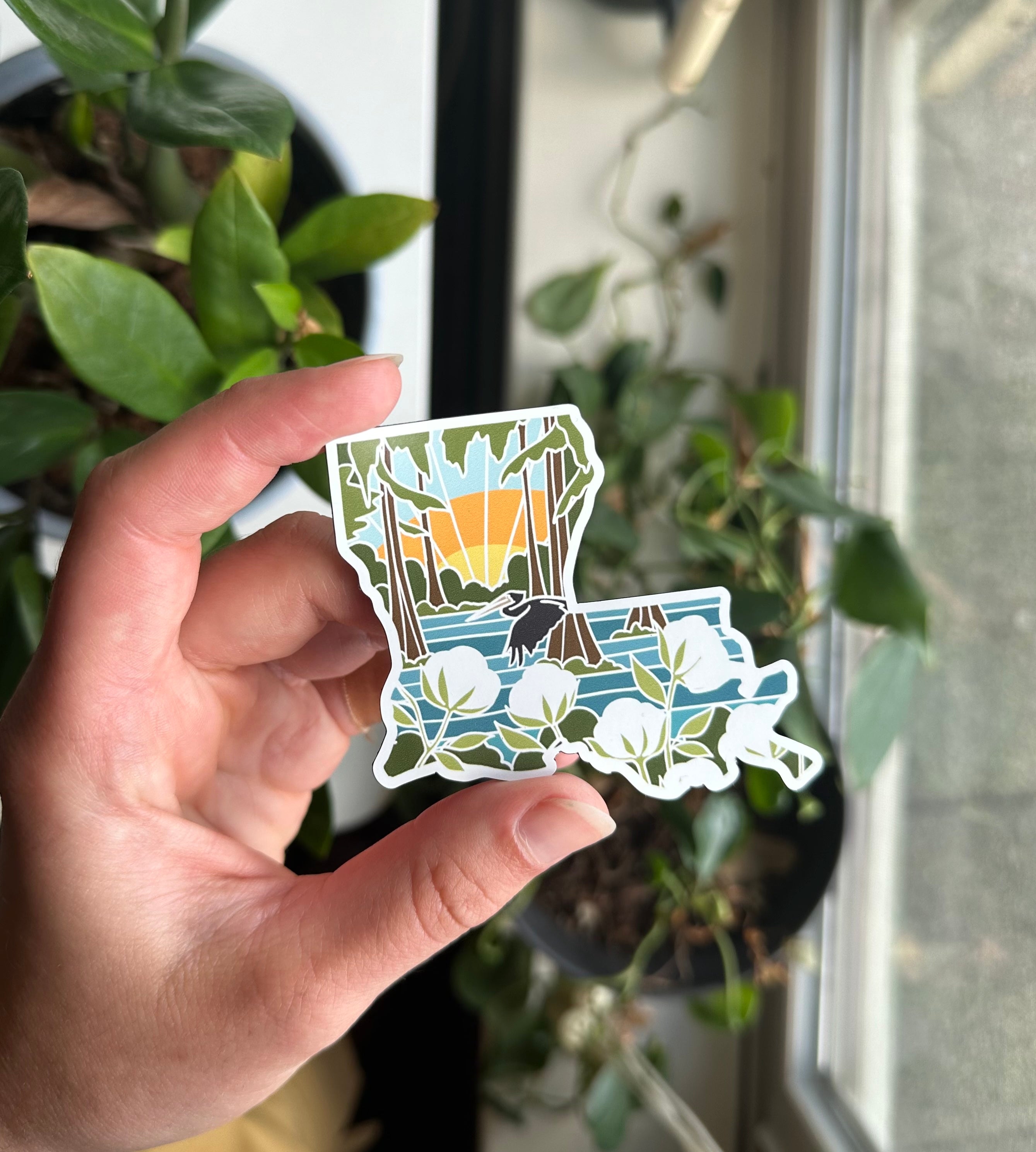 Each magnet is 3" wide—the PERFECT size to jazz up that empty surface you’re thinking of right now. The featured artwork is an original design by Summer Stokes and is inspired by Louisiana’s beloved landscape.