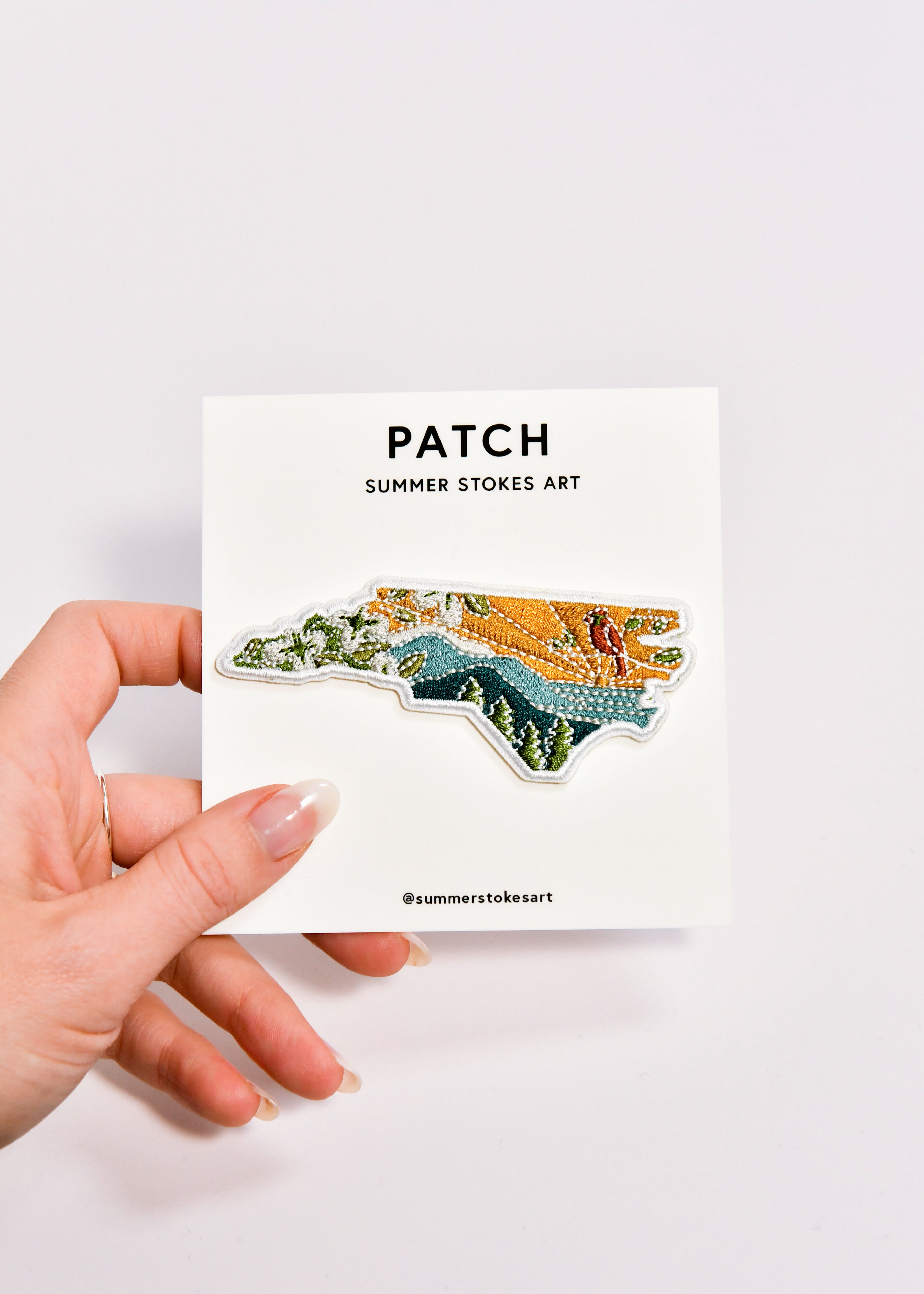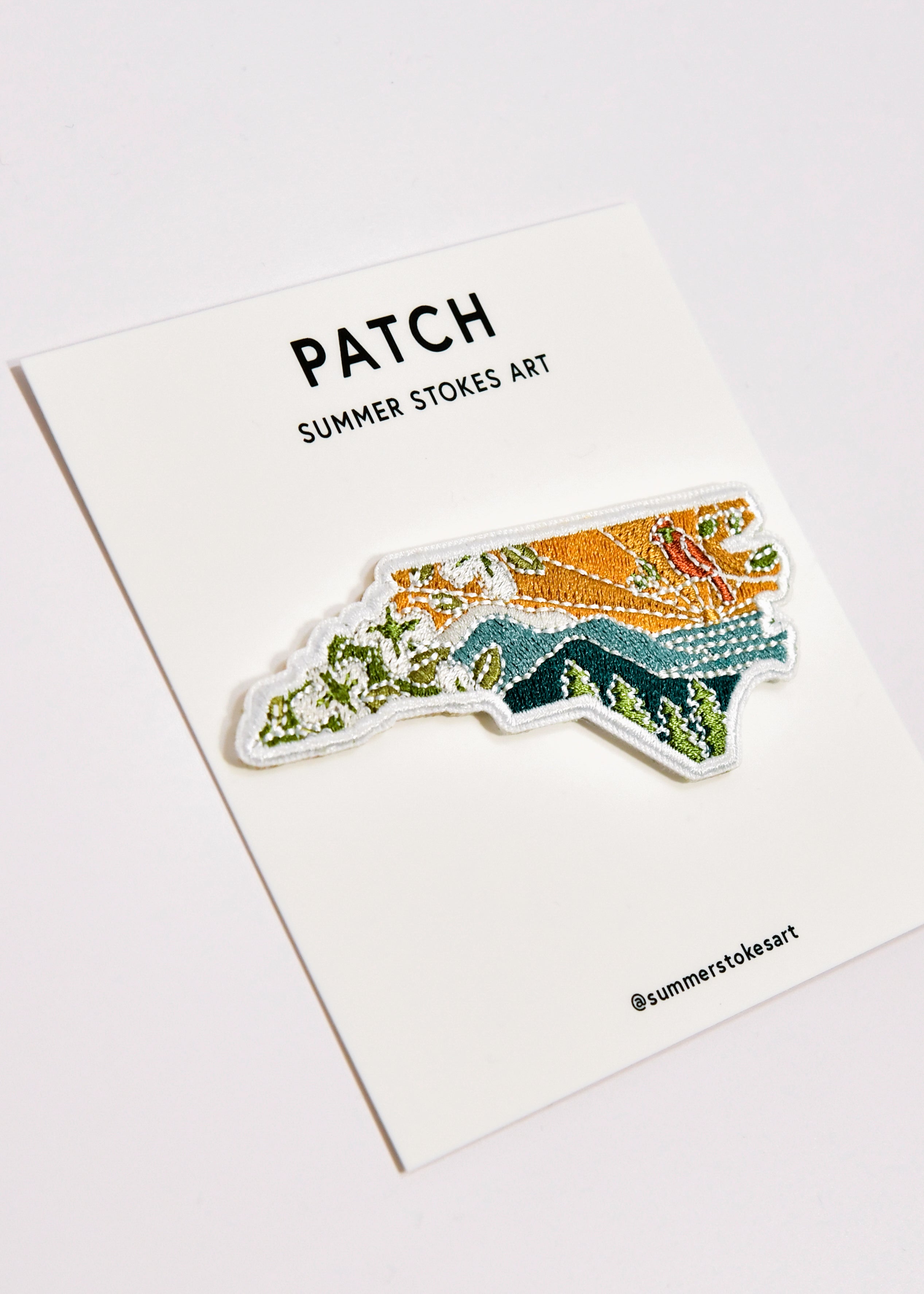 Each patch is 3.75" (the PERFECT size for that empty space you’re thinking of right now) and is machine-embroidered with fusible interfacing on the back. The featured artwork is an original design by Summer Stokes and is inspired by North Carolina’s beloved landscape.
