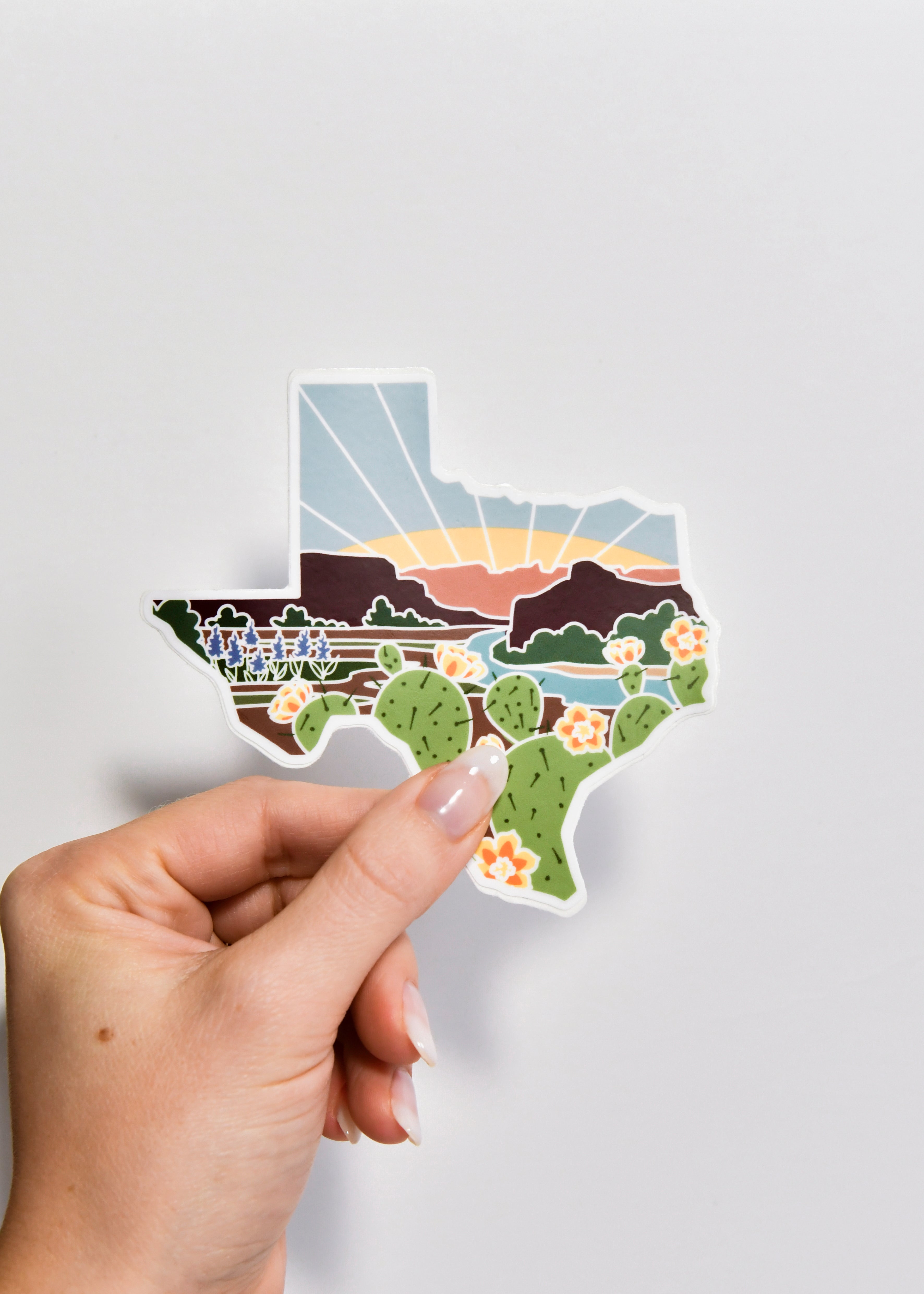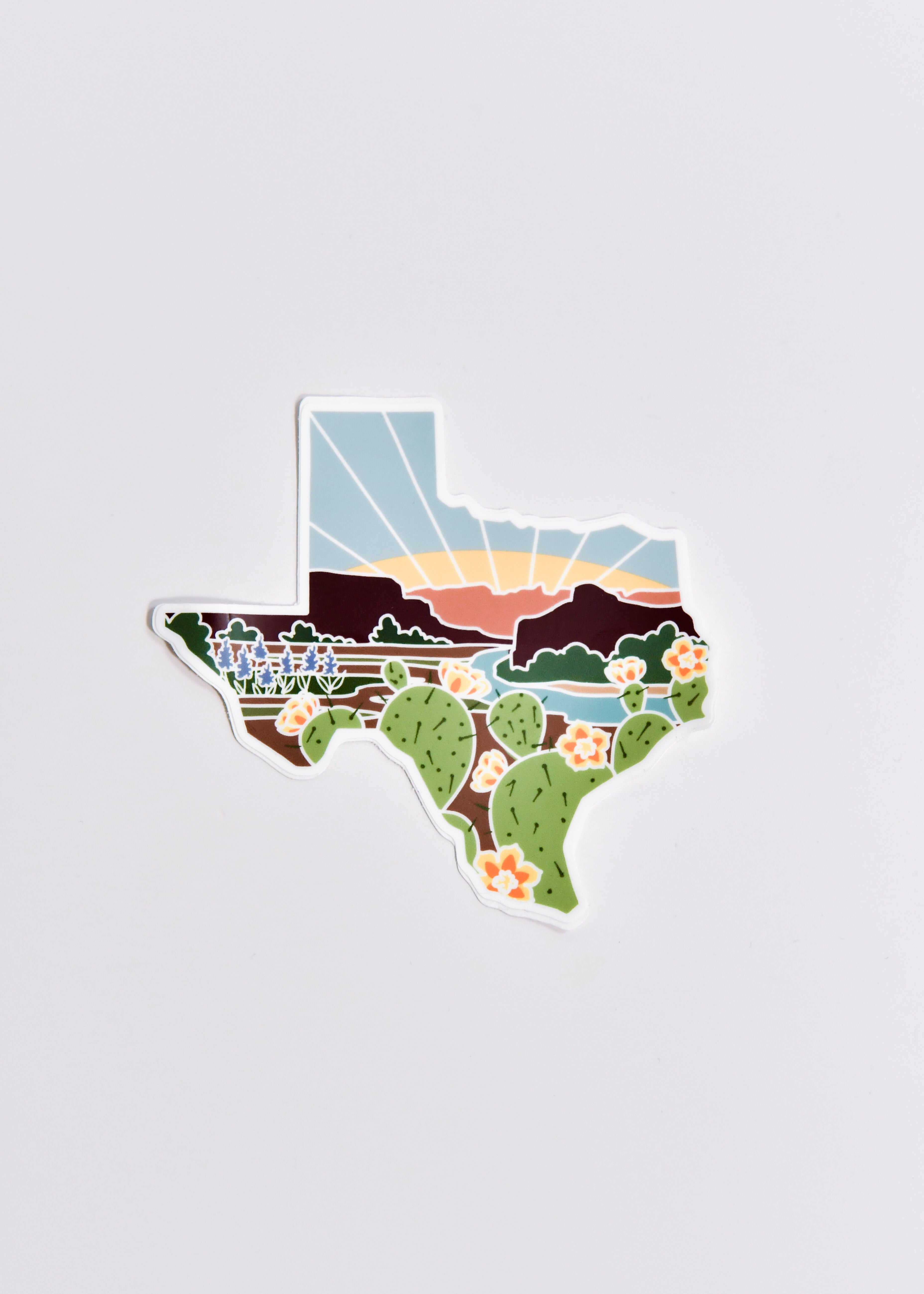 Each sticker is 4" wide—the PERFECT size to jazz up that empty surface you’re thinking of right now. The featured artwork is an original design by Summer Stokes and is inspired by Texas’s beloved landscape.