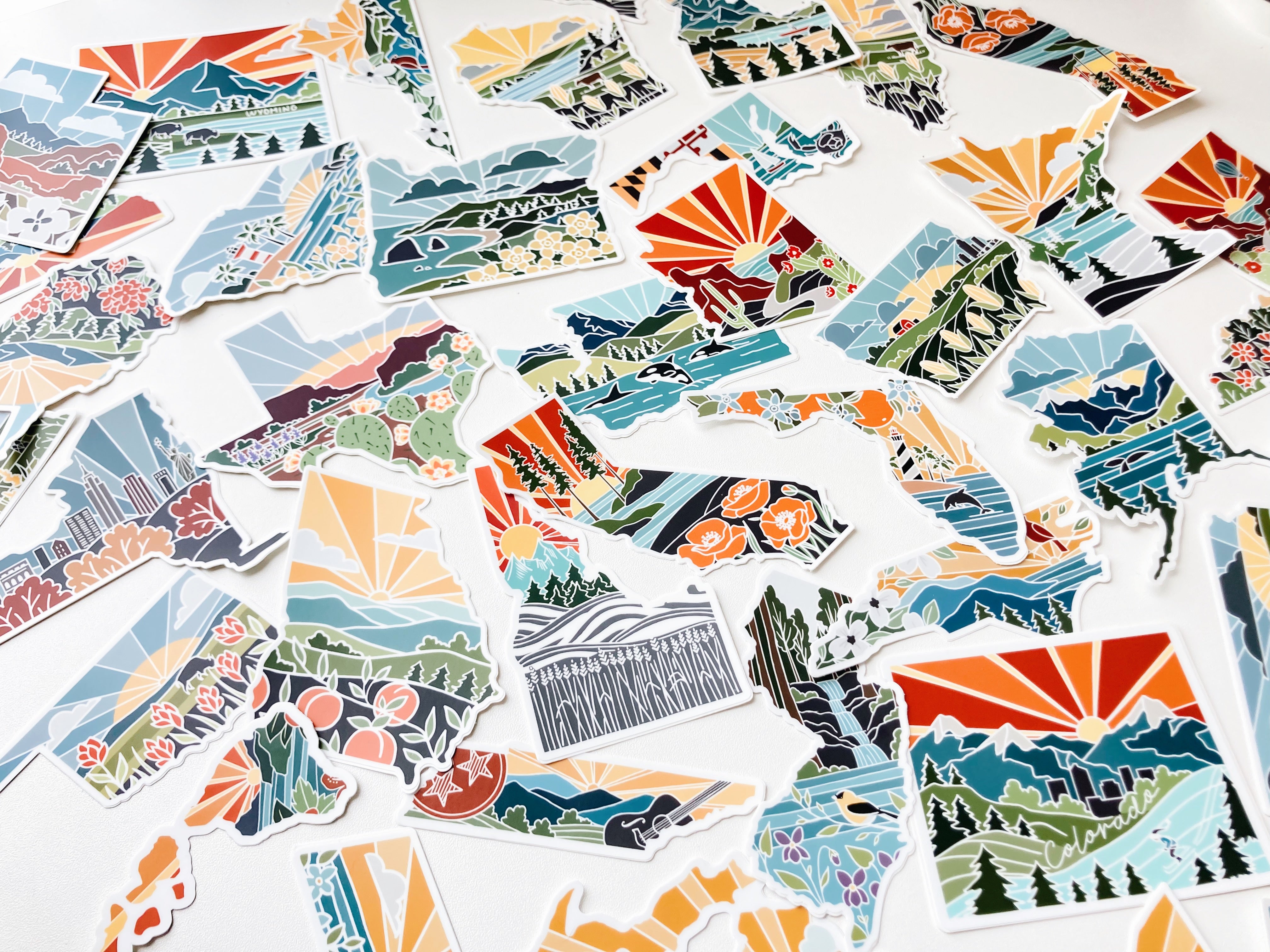 Sticker pack includes: 50 stickers, one of each state not including D.C., US Territories, or any Freely Associated States.