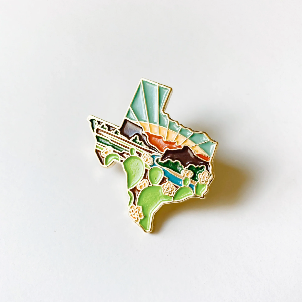 Each pin is 1.25" (the PERFECT size for that empty space you’re thinking of right now) and is laser-engraved and enamel-filled, preserving every tiny detail of the design. The featured artwork is an original design by Summer Stokes and is inspired by Texas’s beloved landscape.